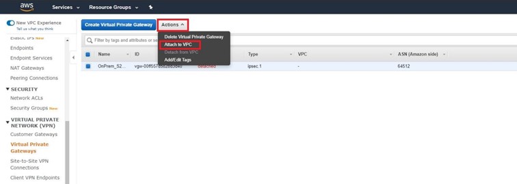 Actions altından Attach to VPC diyerek ekleme işlemini yapıyoruz.