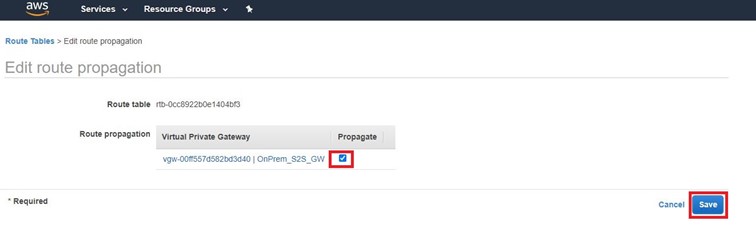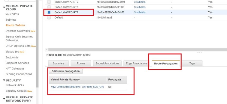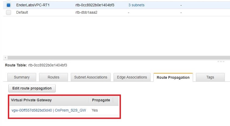 VPN gateway’in bilgilerinin Route Table içinde yaygınlaştırılması için ilgili VPC’nin Route Table’ına gelerek Route Propagation altında bulunan Propagation bilgisini ENABLE hale getirmemiz gereklidir. Edit diyerek devam ediyoruz.