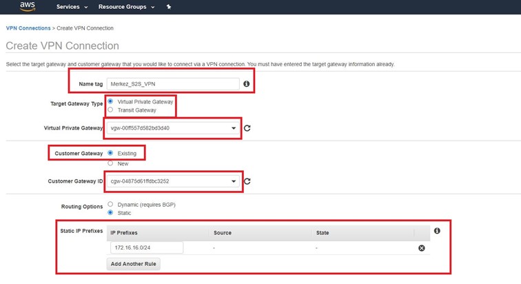 Site-to-Site VPN Connections kısmına geliyor ve Create VPN Connection oluşturmaya başlıyoruz.