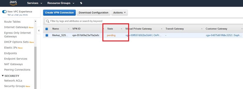 AWS üzerine gelip VPN bağlantımızı kontrol ediyoruz. Şuan kullanılabilir durumda.