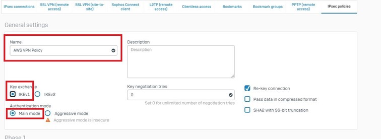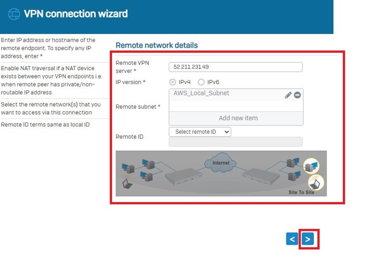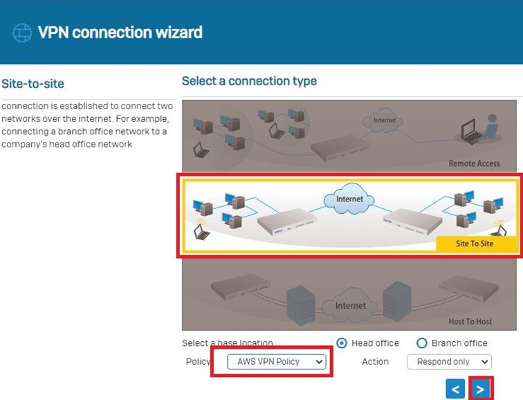 Site-to-Site bağlantı türünü ve oluşturduğumuz AWS VPN Policy’yi seçerek devam ediyoruz.