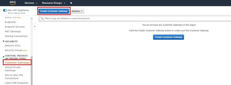 VPC Dashboard üzerinde bulunan Customer Gateways kısmına geliyoruz ve Create Customer Gateway ile oluşturmaya başlıyoruz.