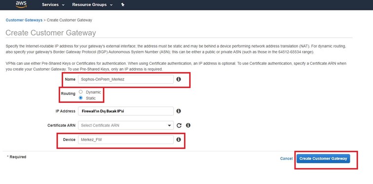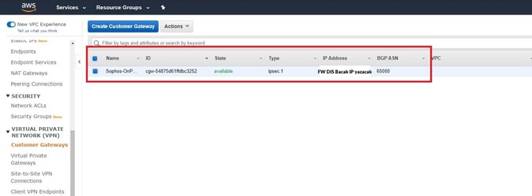 Customer Gateways On-Prem yapımızda bulunan Firewall’ın bilgilerinin tutulduğu kısım.