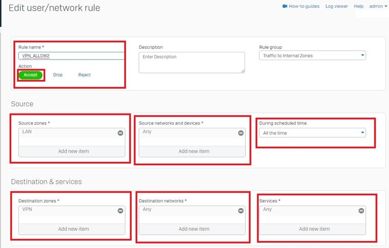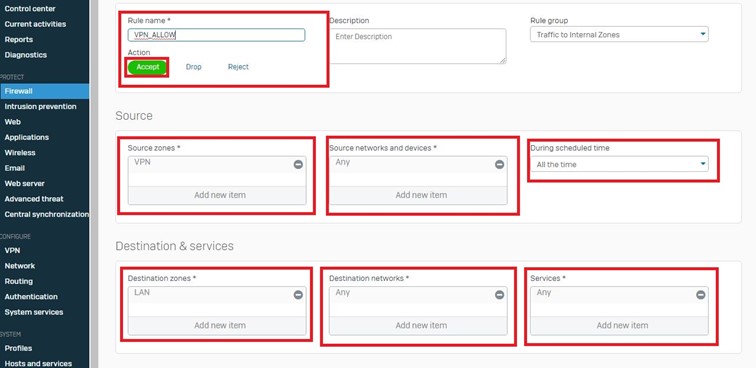 Destination olarak LAN network’üne ve tüm servislere erişim veriyoruz.