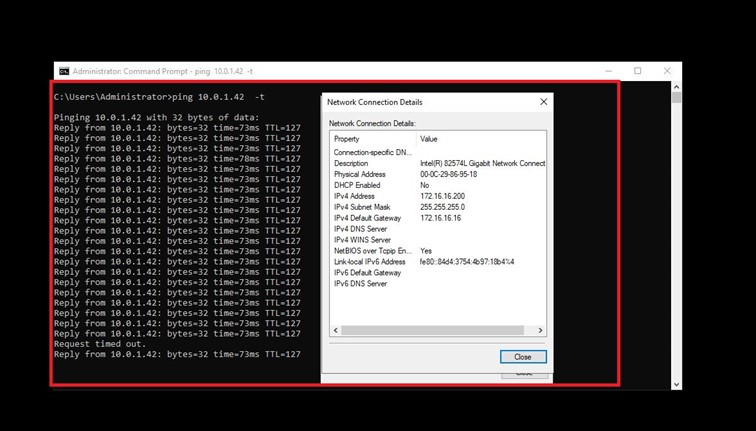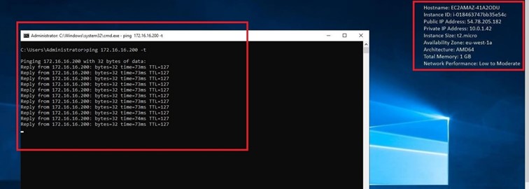 Site-to-Site VPN kurulumunu test etmek için AWS üzerinde bulunan bir Instance’dan On-Prem yapımızdaki bir makineye ping testi başlatıyoruz ve paketlerin gittiğini görüyoruz.