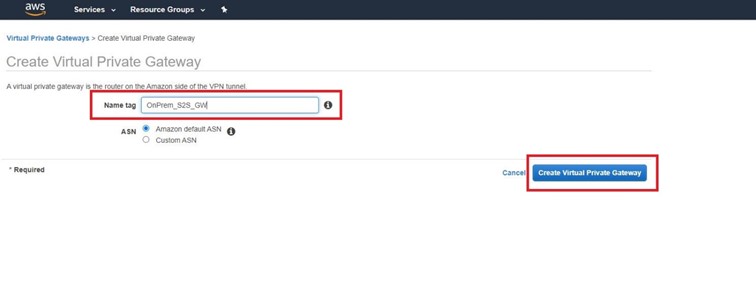 Oluşturduğumuz Gateway’e bir isim veriyoruz ve default ASN (otonom sistem numarası) Amazon ataması için aşağıdaki gibi seçim yapıyoruz ve Create Virtual Private Gateway diyerek oluşturuyoruz.