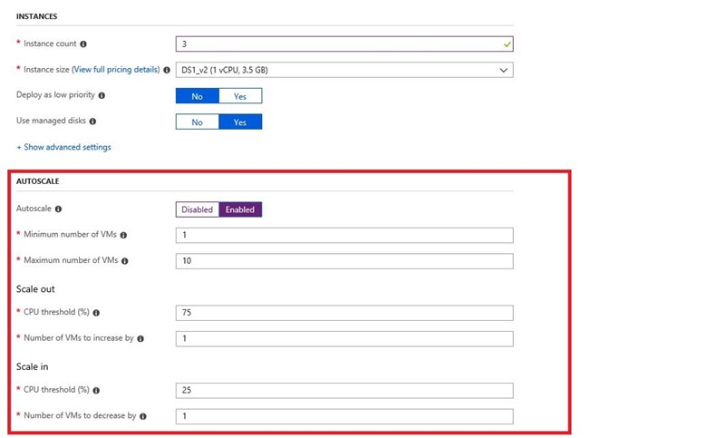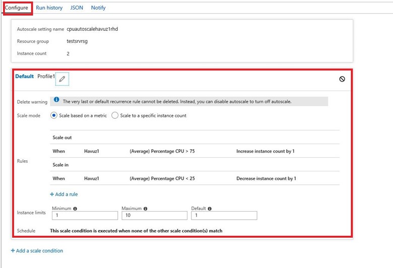 AutoScale kısmı ise bizim için önemli olan bölüm.Bu kısımda otomatik olarak çoğaltılacak VM sayısını belirliyoruz.Çoğaltılacak VM’lerin hangi kurallar içerisinde çoğaltılacağını belirliyoruz.Mesela CPU kullanımı %75 olduğunda VM’ler çoğaltılsın CPU kullanımı %25 olduğunda düşürülsün gibi.