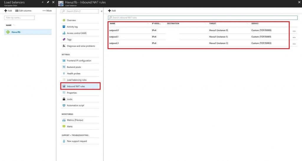 12.Makinelere bağlanabilmek için gerekli Nat kurallarını oluşturuyoruz.Ayrıca Resource Group üzerinde bulunan NSG network security group içinde gerekli olan yetkilendirmeleri yapmayı unutmayınız.RDP,HTTP vb.