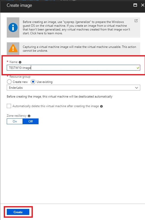 4.Oluşturcağımız Capture Image’a bir isim veriyoruz ve Resource Group’u belirliyoruz ve oluşturma işlemini başlatıyoruz.